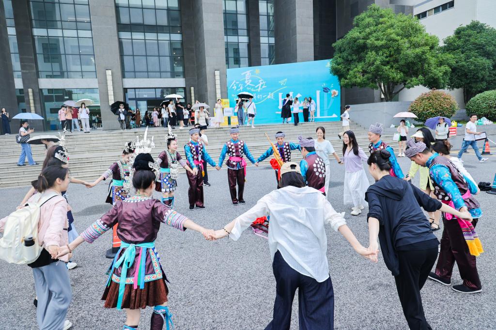 6月14日中午及下午,市校共建办公室、人文学院组织的校园快闪在一食堂、四食堂、图书馆前广场、曲水桥、体育中心等点位分别开展。快闪现场,从江县民族艺术团为师生们带来了精彩表演和体验互动,现场气氛热烈,让师生们近距离感受到了从江县民族艺术的独特魅力与深厚底蕴。