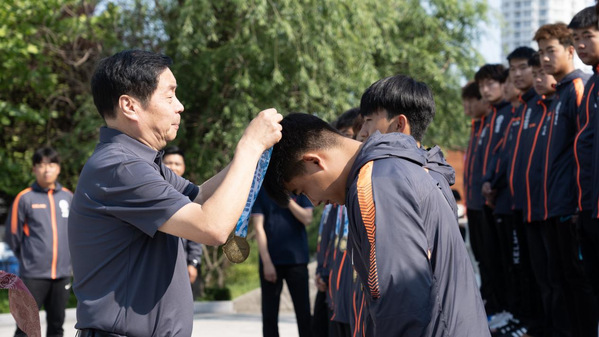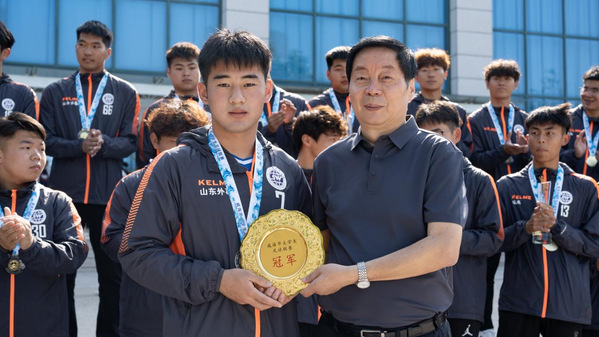 赛后返校,学校党委书记徐东升出席颁奖仪式,为球队颁奖并发表讲话。他表示,此次勇夺冠军,是山外大学子坚持不懈、奋勇拼搏的最好见证。从备战时的艰苦训练,到小组赛、半决赛的奋力拼搏,再到决赛中逆境翻盘、奋勇争先,队员们始终保持高昂斗志,展现出团结协作、永不言弃的精神风貌。山东外事职业大学足球队的成功不仅是对团队精神的生动诠释,更为全校师生树立了榜样。希望队员们继续发光发热,带动更多同学投身体育锻炼,为学校争得更多荣誉。