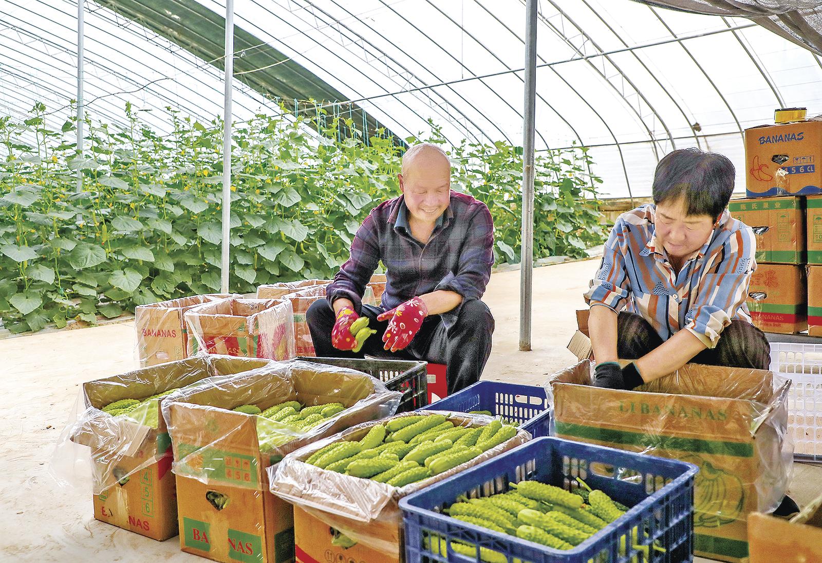 板桥镇白黄瓜保种产业园内,群众将采摘的白黄瓜装箱。 (资料图)