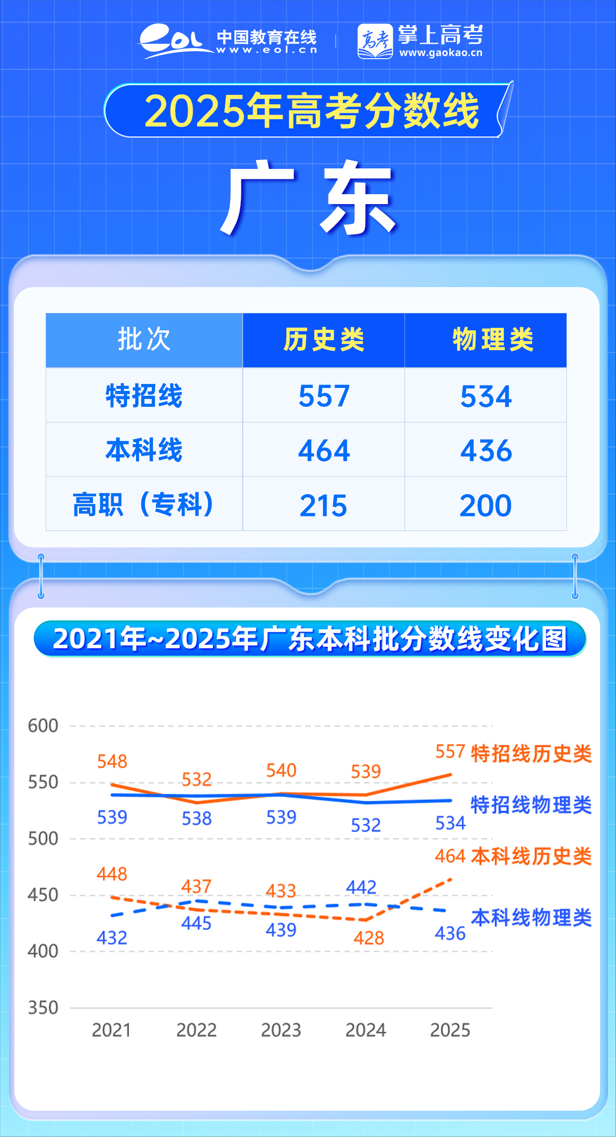经省招生委员会研究决定,广东省2025年普通高校招生各批次录取最低分数线如下:
