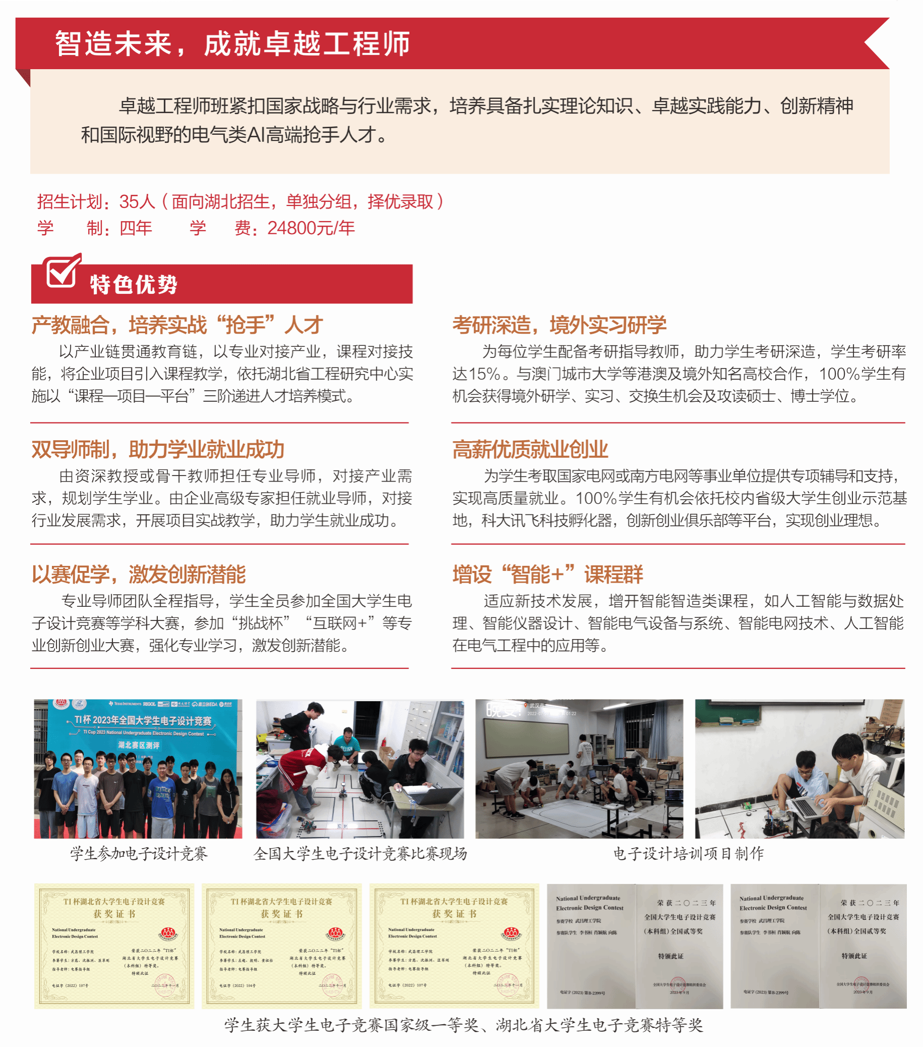 6月25日,武昌理工学院宣布推出电气类专业“卓越工程师班”,首次面向湖北省内招收35名优秀学子。该班紧扣国家战略与行业前沿,致力于培养兼具扎实理论基础、顶尖工程实践能力、创新思维及国际视野的电气与人工智能融合型高端人才,以满足市场对复合型“抢手”人才的迫切需求。