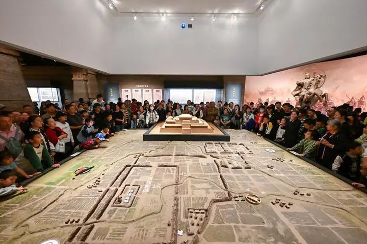 游客在河北省邯郸市博物馆观看赵都邯郸王城复原沙盘。(资料照片)