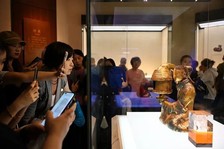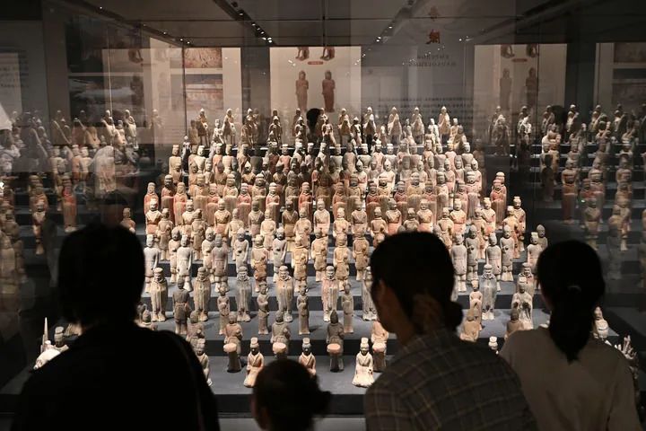 10月4日,游客在位于河北省邯郸市磁县的北朝考古博物馆内观看文物陈列。新华社记者 李鑫 摄
