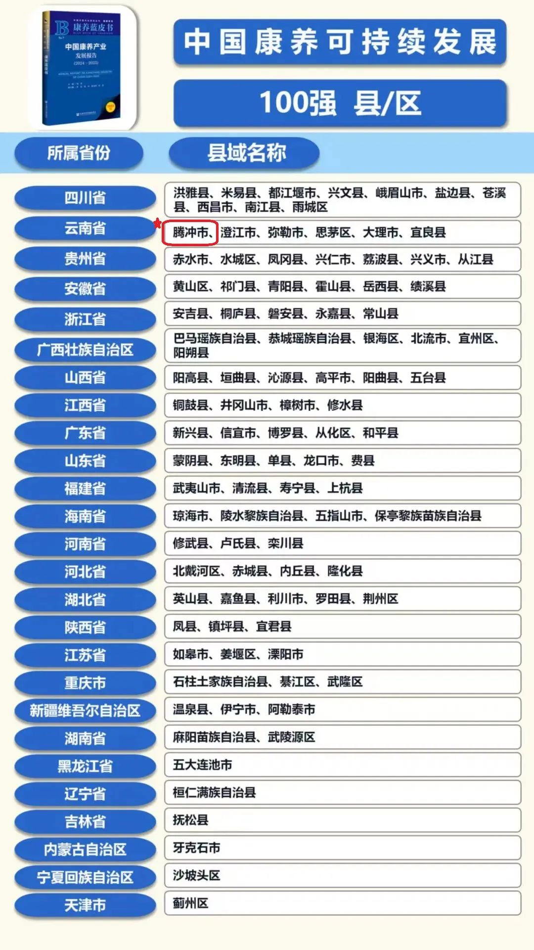 6月21日,《康养蓝皮书:中国康养产业发展报告(2024-2025)》重磅推出“中国康养产业可持续发展能力 20 强市”和“中国康养产业可持续发展能力100 强县”,其中,腾冲市成功入选中国康养产业可持续发展能力百强县。