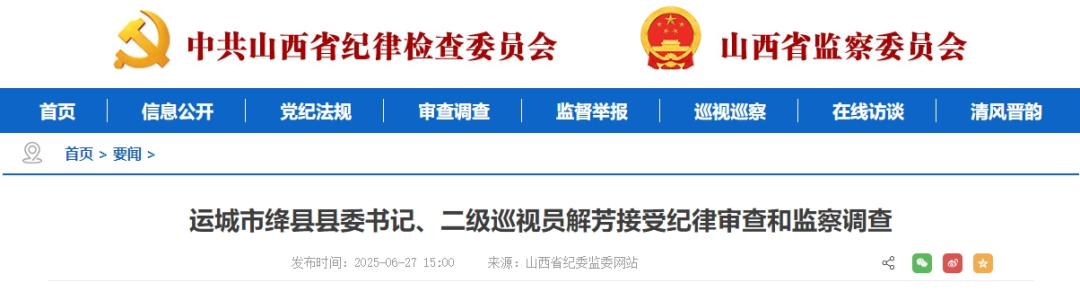 运城市绛县县委书记、二级巡视员解芳涉嫌严重违纪违法,目前正接受省纪委监委纪律审查和监察调查。