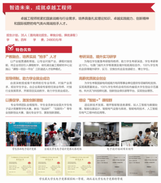 学校开设“华为精英班”、电气工程及其自动化“卓越工程师班”、工商管理精英班等特色班。制定专门的人才培养方案实施精准育人,配备硬核师资助力学业就业成功。