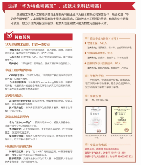 武昌理工学院人工智能学院与全球领先科技企业华为技术有限公司深度合作,联合打造“华为精英班”。依托华为先进技术资源,培养具备国际视野、扎实理论和技术能力的应用型抢手人才。