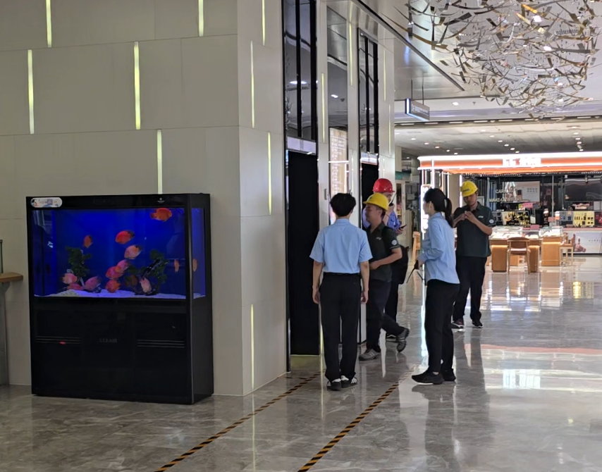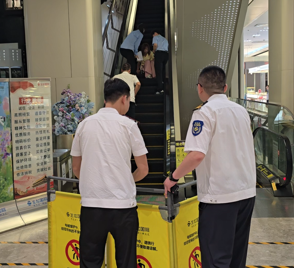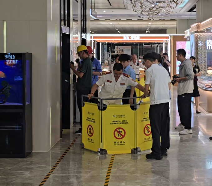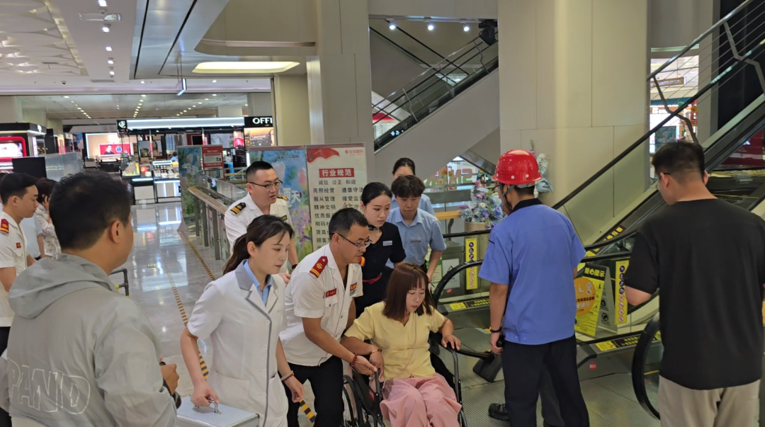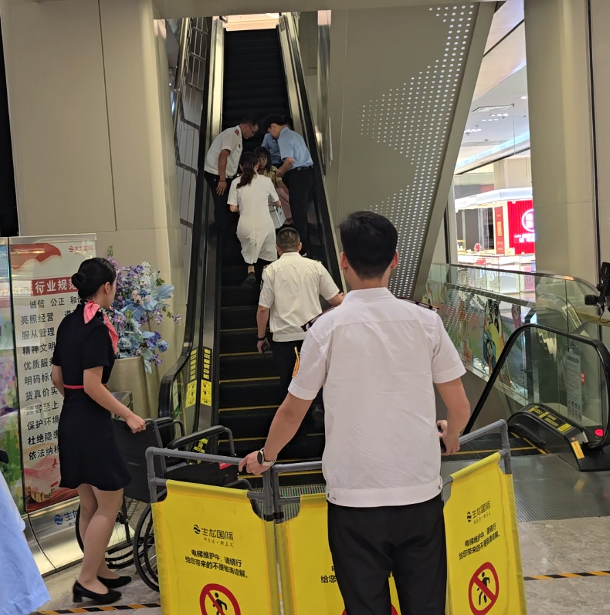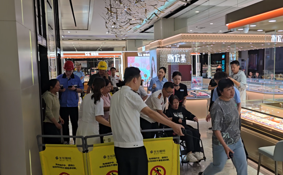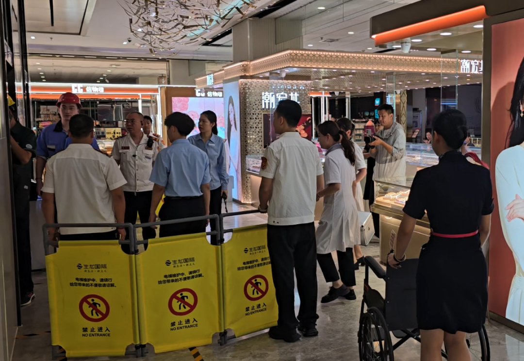 第一演练项目:扶梯故障救援,顾客被卡,商场工作人员进行安抚;