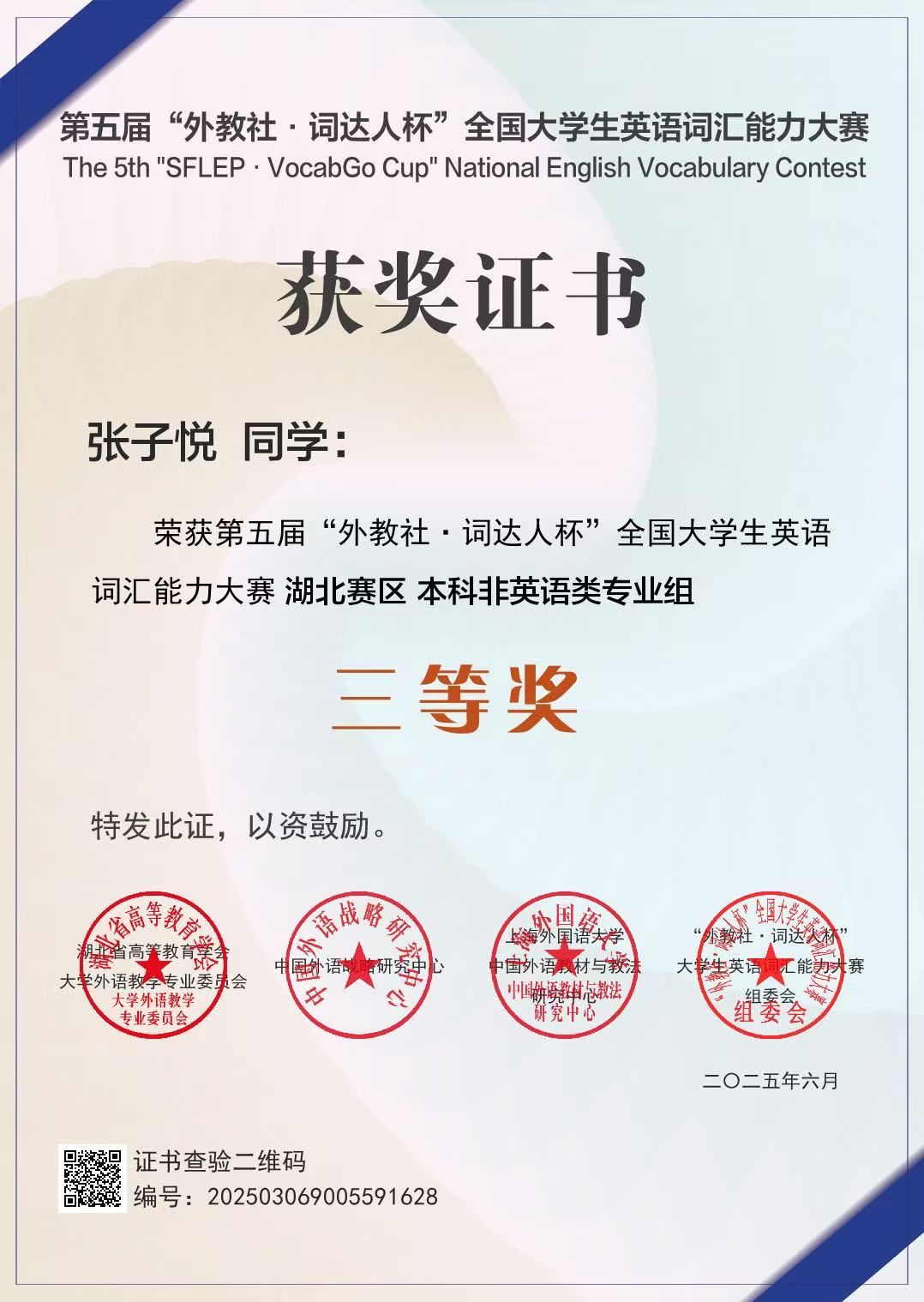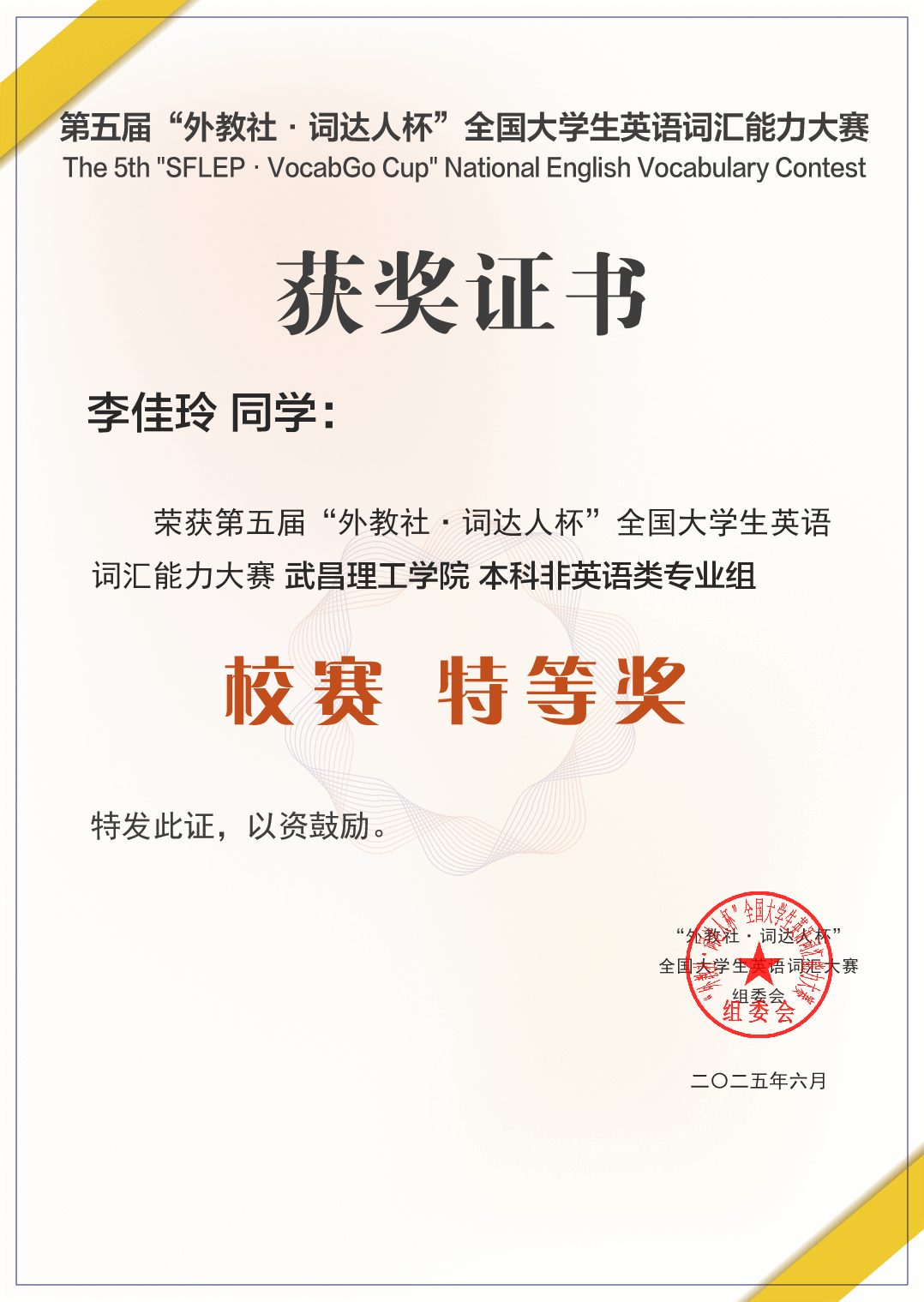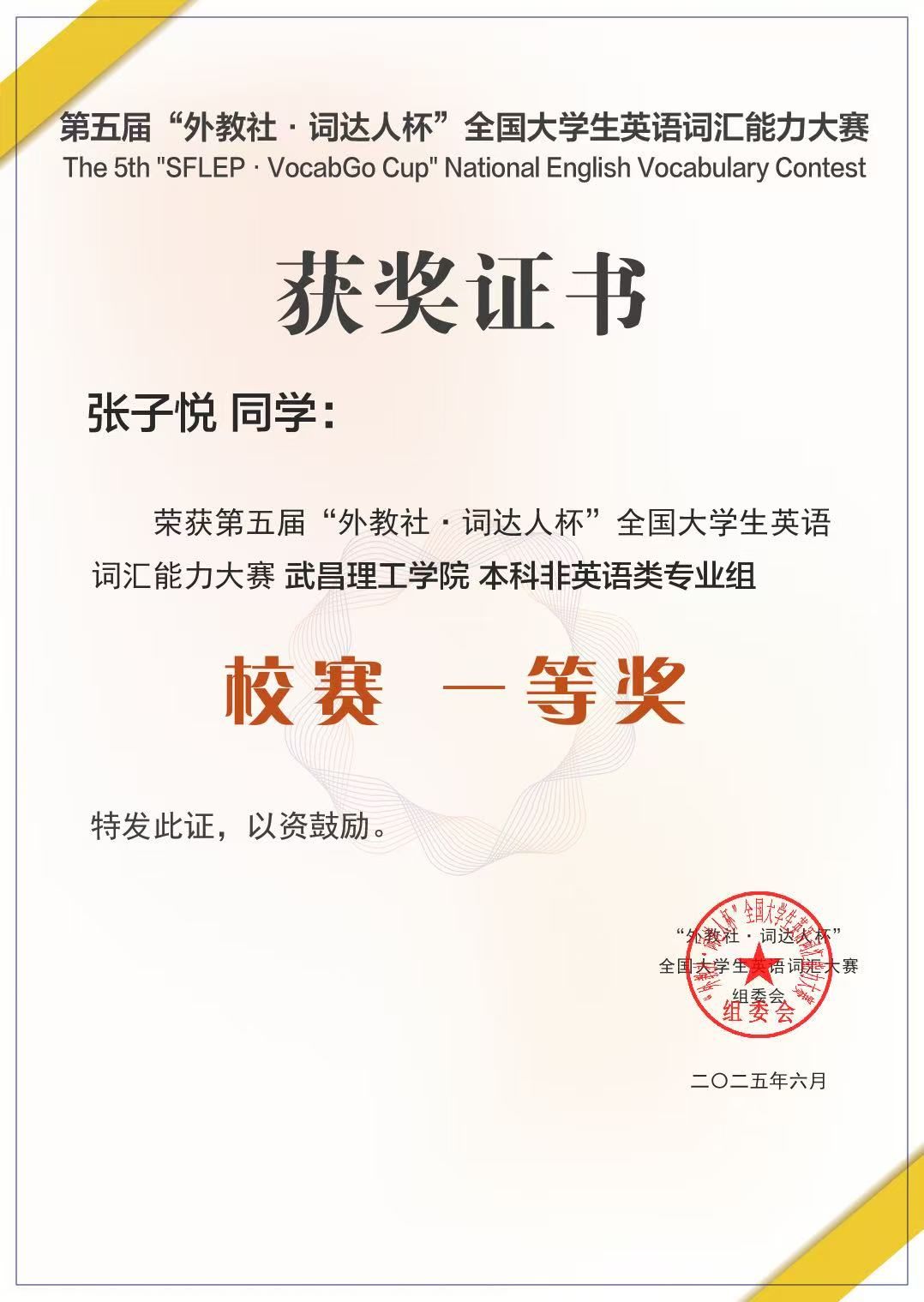 6月21日从武昌理工学院获悉,第五届“外教社・词达人杯”全国大学生英语词汇能力大赛成绩揭晓,武昌理工学院学子凭借扎实的词汇功底与不懈努力,在校赛和省赛中均取得优异成绩。