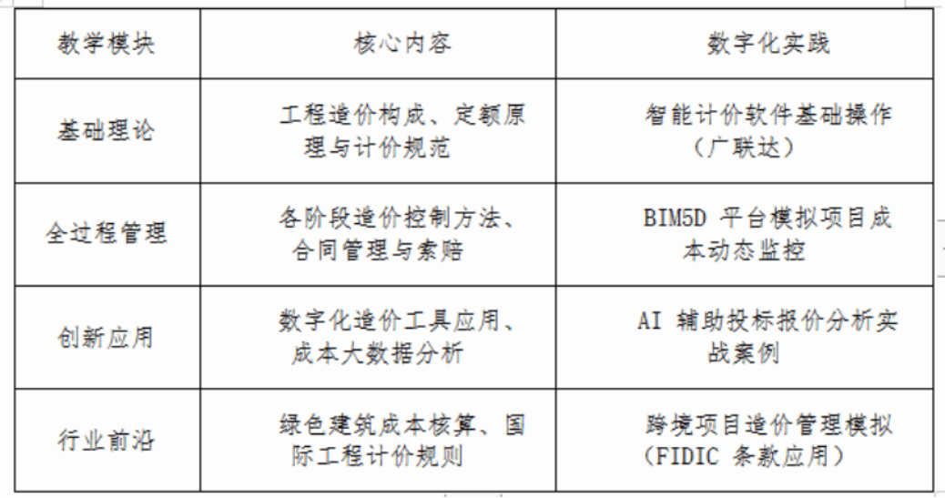 课程内容紧密贴合行业趋势,从项目规划到竣工结算,绿色建筑造价、装配式建筑成本优化等前沿内容都是教学重点。同时,课程融合工程经济、法律和数据分析知识,让学生明白,做好工程造价需要多方面能力。课堂上,老师用实际案例讲解数据存证,学生在操作实践中,仿佛化身解决问题的能手。