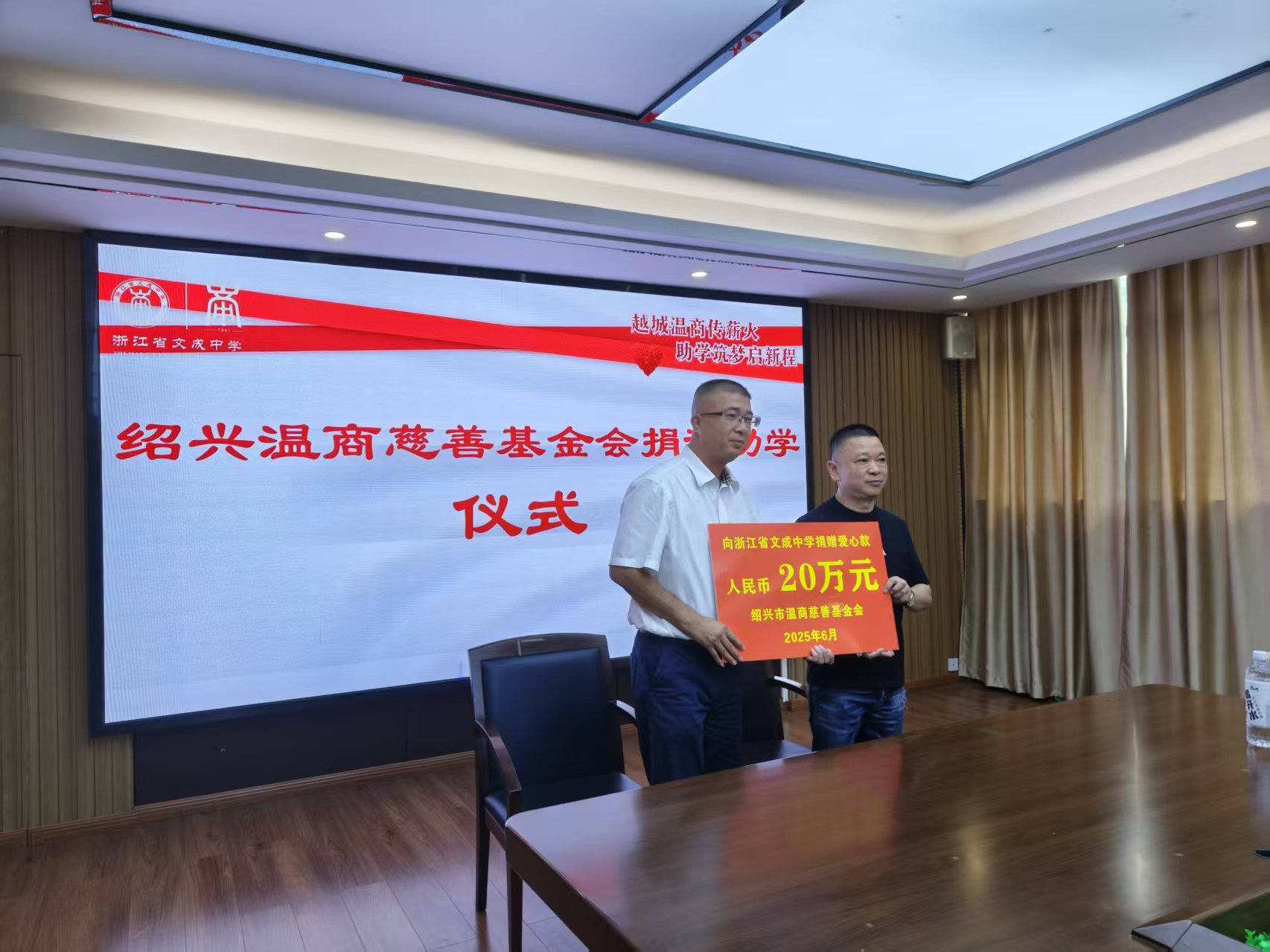 公益助学捐赠仪式上,绍兴市温商慈善基金会和文成县关工委签订了爱心助学合作意向协议,绍兴市温商慈善基金会代表与文成中学校长交接爱心捐赠牌。据了解,本次结对的学生为15名,温商慈善基金会将分三年斥资20万元进行资助帮扶。