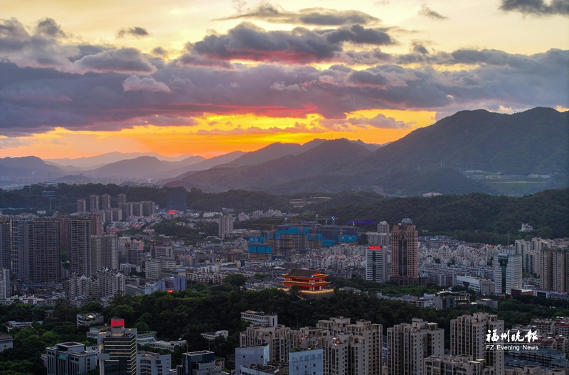 6日傍晚,受台风外围影响,福州上空出现火烧云。记者包华摄
