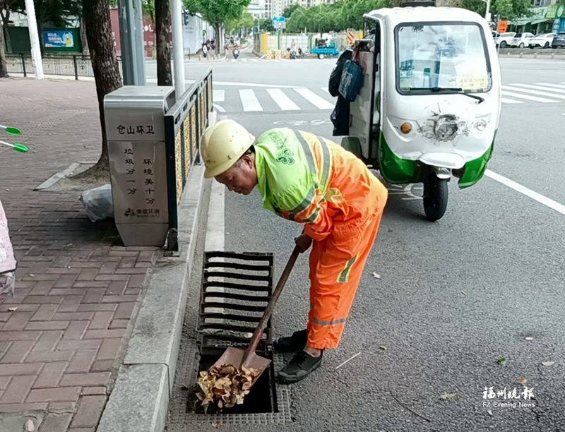环卫工人清疏路面雨水井。市城管委供图