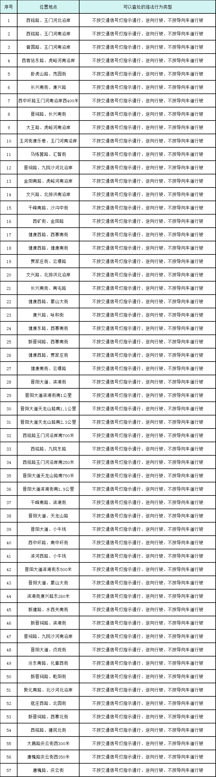 本次新增的固定式交通技术监控设备公示时间自2025年7月9日至2025年7月15日。公示期结束,太原市公安局交通警察支队将正式启用以上固定式交通技术监控设备,对设置地点相关路口、路段机动车不按交通信号灯指示通行、逆向行驶、不按导向车道行驶等交通违法行为进行摄录取证及查处。望广大交通参与者及道路沿线商户、居民支持配合。请自觉遵守交通安全法律、法规,注意行车安全,珍爱生命,平安出行。
