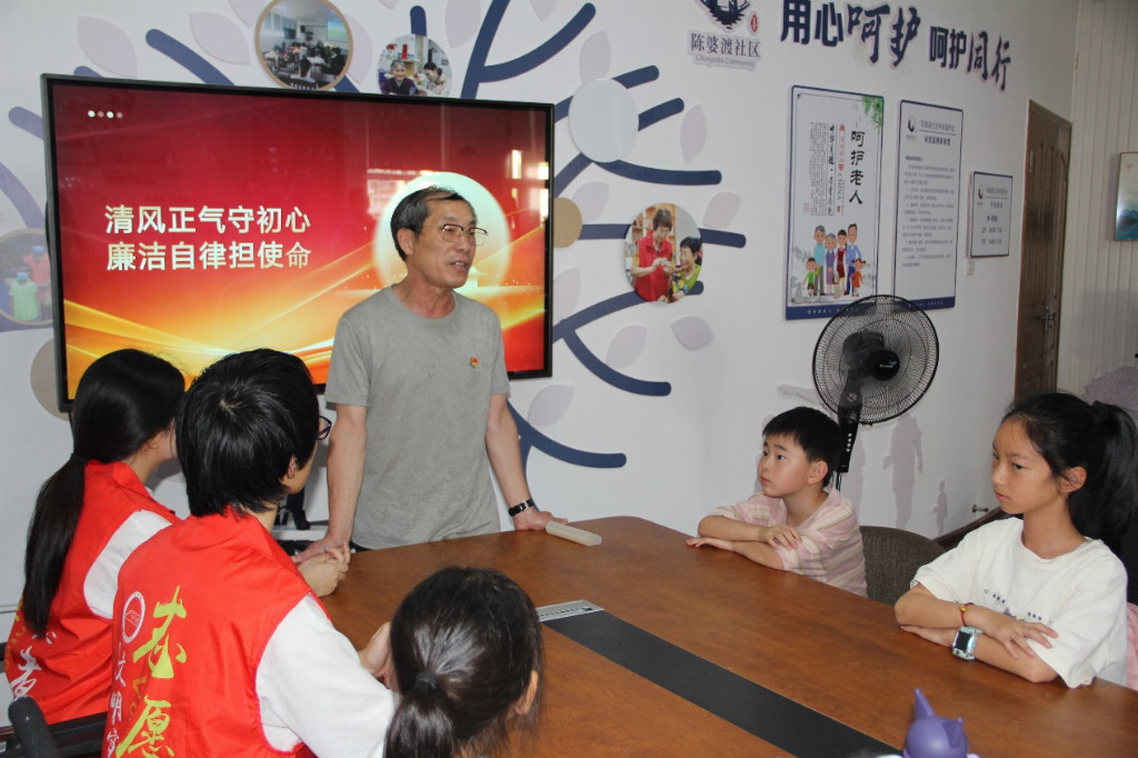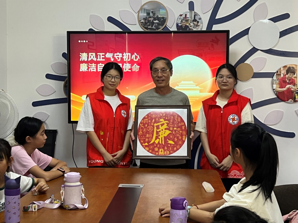 为了进一步加深青少年对廉洁文化的认识,该实践队还邀请了一位社区里的老党员为青少年讲述红色记忆。那段关于信仰、纪律与坚守的红色记忆,如同一股清泉,流淌进台下实践队员和青少年们的心田。稚嫩的眼眸里闪烁着敬仰与思考,历史的“廉”音与新时代的心跳在此刻同频共振。为了表达对那段红色记忆的尊重,“剪廉映心•纸韵清风”廉洁文化宣传实践队全体成员精心制作了一副 “廉字图”送给老党员。