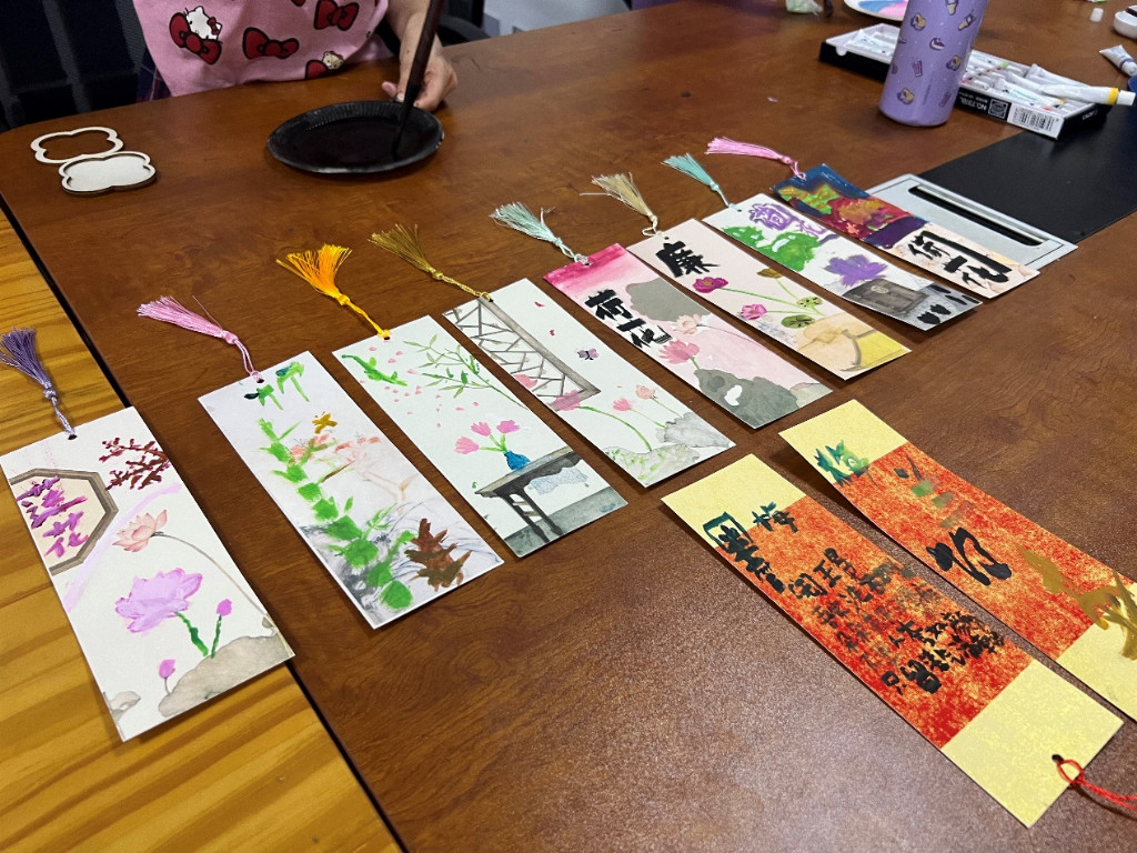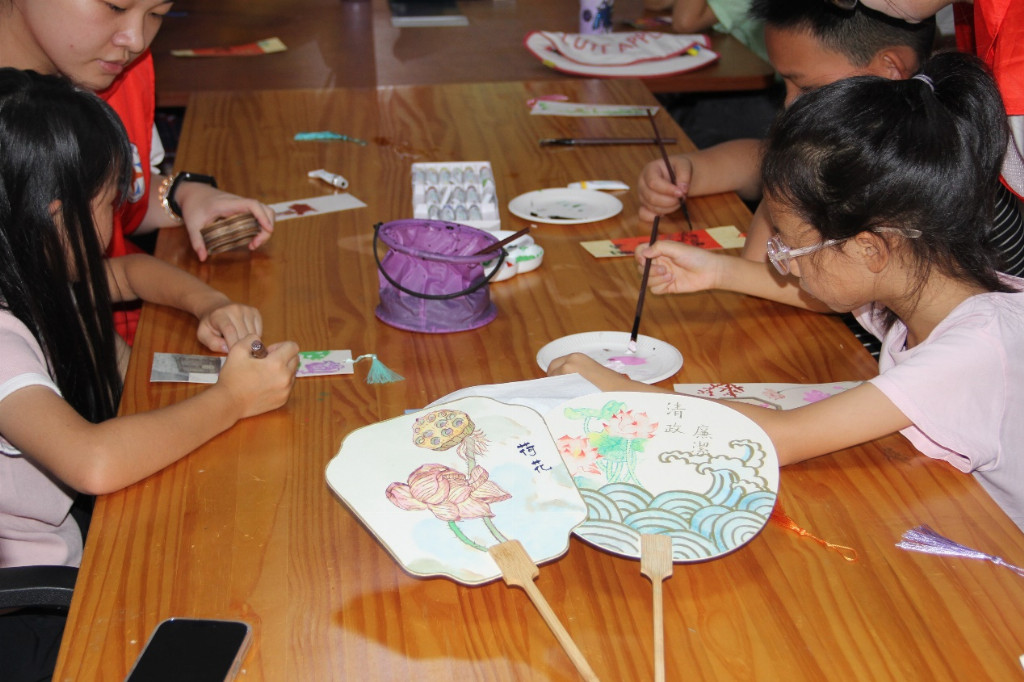 一大早,身穿红色马甲的实践队员们带着廉洁剪纸作品、空白书签、水墨笔、颜料等材料来到了陈婆渡社区廉洁驿站,带领社区的小朋友们一同欣赏廉洁剪纸作品,并在书签、扇子与画笔间探寻“清廉”之美。画笔起舞,一朵朵象征高洁的“廉”花在孩子们手中绽放;彩绳穿梭,一枚枚寓意分明的“廉”字钥匙扣逐渐成形;素雅的书签上,端正的廉洁格言在笔尖流淌。小小艺术家们屏息凝神,小脸写满专注,虽然手法略显稚嫩,但那份投入却无比真诚。“看!我的莲花画好啦!”清脆的童音里,廉洁的幼芽已悄然在心田破土。