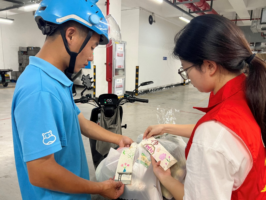 为了进一步促进廉洁文化的传播,活动结束后,该实践队与社区工作人员带着满载童真祝福的廉洁书签,走进了骑手装货区。“您好!这是我们和社区小朋友一起做的廉洁小书签,想邀请您把它挂在外卖箱或外卖袋上,让这份‘清风’随着您的订单,传递给千家万户,您愿意成为我们的‘清风使者’吗?”队员们热情地介绍着。新奇而有意义的提议立刻得到了响应,顷刻间,外卖装货区变成了“清风传递驿站”。一位年轻的骑手接过一枚廉洁书签,郑重地挂在了自己醒目的外卖箱上。这些廉洁文创化身成最灵动的廉洁“信使”,搭载着外卖骑手的足迹,穿梭于楼宇巷陌,将清廉的芬芳,精准“配送”至城市的每一个角落。