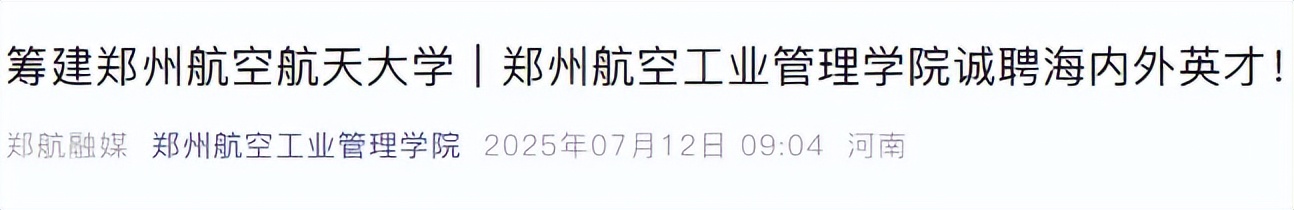 2021年11月,河南省下发《关于提升高校科技创新能力的实施意见》,提出要组建电子科技大学、航空航天大学等新型研究型工科大学,填补电子科技、航空航天、体育、美术等类型本科高校空白。2024年8月,河南省人民政府办公厅发布关于印发促进全省低空经济高质量发展实施方案(2024—2027年)的通知。《方案》提出,加快组建郑州航空航天大学,加快建设郑州航空航天大学新校区。