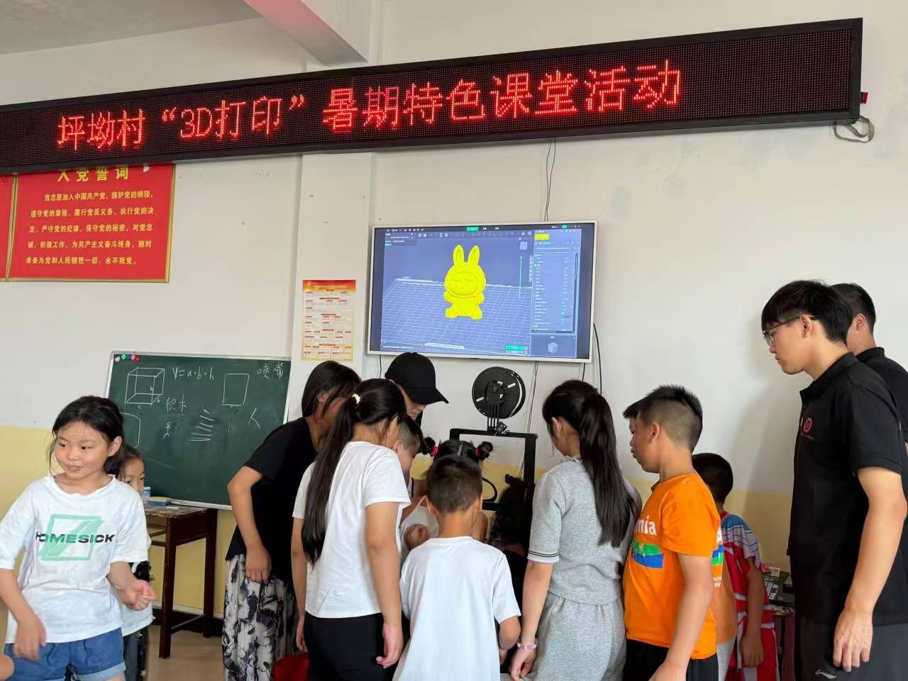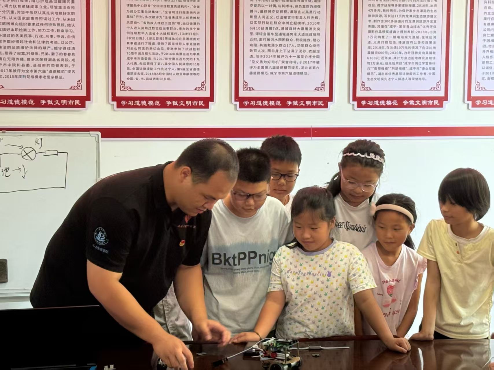 其中,人工智能学院“启元计划”星火志愿服务队在行前开展了为期一个月的系统培训。抵达目的地后,团队迅速响应,在当地社区干部支持下深入了解学生学情,并对覆盖9个支教点位(4个社区、5个行政村)的调查数据进行细致分析。针对当地普遍存在的多年级混合教学现状,团队果断调整方案,创新采用“跨年龄分组差异化教学”模式。他们充分发挥专业优势,开设了智能科普、编程启蒙、AI应用体验等七大类特色课程:低年级学生在趣味横生的AI绘画、智能语音互动中点燃科技兴趣;高年级学生则通过动手实践,投入到简易机器人编程、单片机模型搭建等更具挑战性的项目中,让前沿科技知识真正融入乡村课堂。