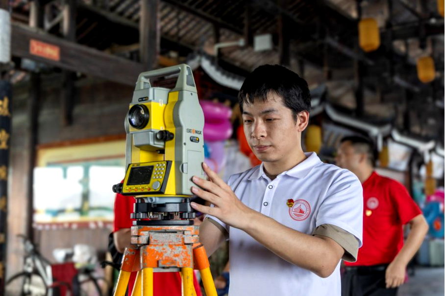 “武陵东来、云贵西望,在抗日战争全面爆发之际,芷江成为必争之地,龙津风雨桥成为重要交通枢纽,在抗战中历经日军数十次轰炸巍然不倒。”在吴振华的现场教学中,龙津风雨桥的红色故事在实践团眼前徐徐展开,成员们在㵲水旁眺望,抗战时期桥上的炮火声、运输声,犹如声声在耳,如今桥上的商贸繁荣、车水马龙,也历历在目。走上龙津风雨桥,实践团成员们细细触摸,为桥梁的廊亭布局、榫卯结构惊叹,桥梁专业的研究生们架起专业设备为桥梁内外进行专业检测,利用无人机进行BIM建模。