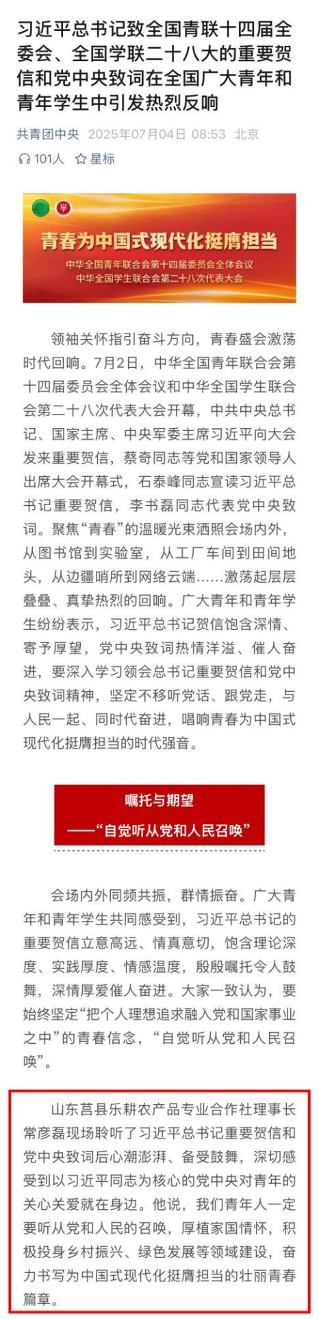 参会期间,常彦磊现场聆听了习近平总书记重要贺信和党中央致词并备受鼓舞,他深切感受到以习近平同志为核心的党中央对青年的关心关爱就在身边,也让他更加坚定了投身乡村振兴的决心。他表示,当代青年人一定要听从党和人民的召唤,厚植家国情怀,积极投身乡村振兴、绿色发展等领域建设,奋力书写为中国式现代化挺膺担当的壮丽青春篇章。