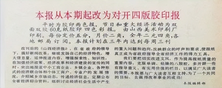 会议还对改刊后的《山西经济报》重新进行了定位:“在省政府的领导下,搞好新闻改革,继续发扬自己的经济特色,增大信息量,延伸报道内容,增强探索性、知识性,在加强经济政策、经济改革和经济建设宣传的同时,介绍城乡市场动态,传递经济信息,定期公布全省经济综合资料,组织讨论经济社会生活中产生的重大问题和趋向,反映群众呼声要求。”