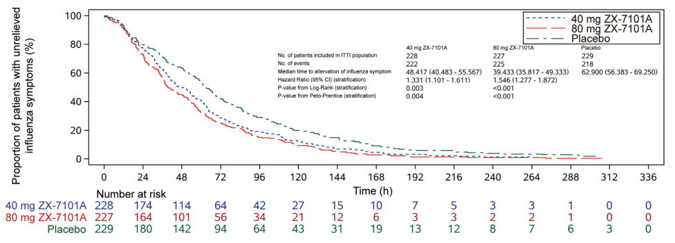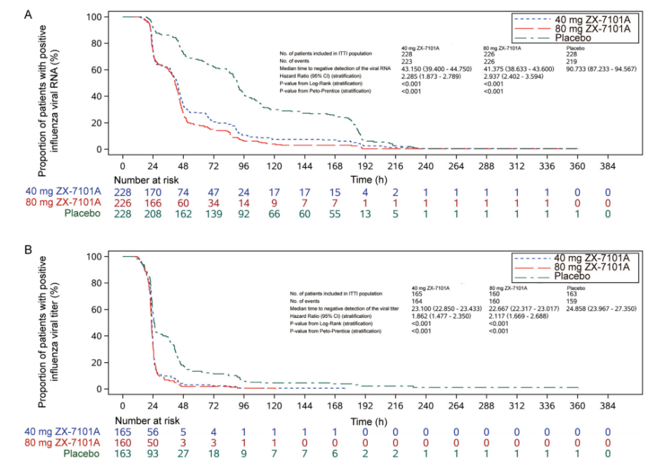 Ⅲ期临床试验数据显示,接受该药物治疗后,患者在39.4小时所有流感症状缓解;同时,体内病毒滴度快速降低,流感病毒滴度中位转阴时间为22.7小时,病毒核酸检测转为阴性的时间相较于安慰剂组显著缩短 。