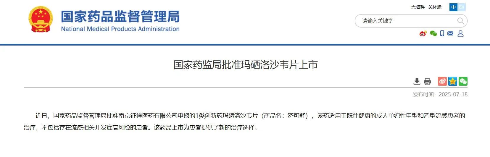 图 1 国家药品监督管理局批准玛硒洛沙韦片上市