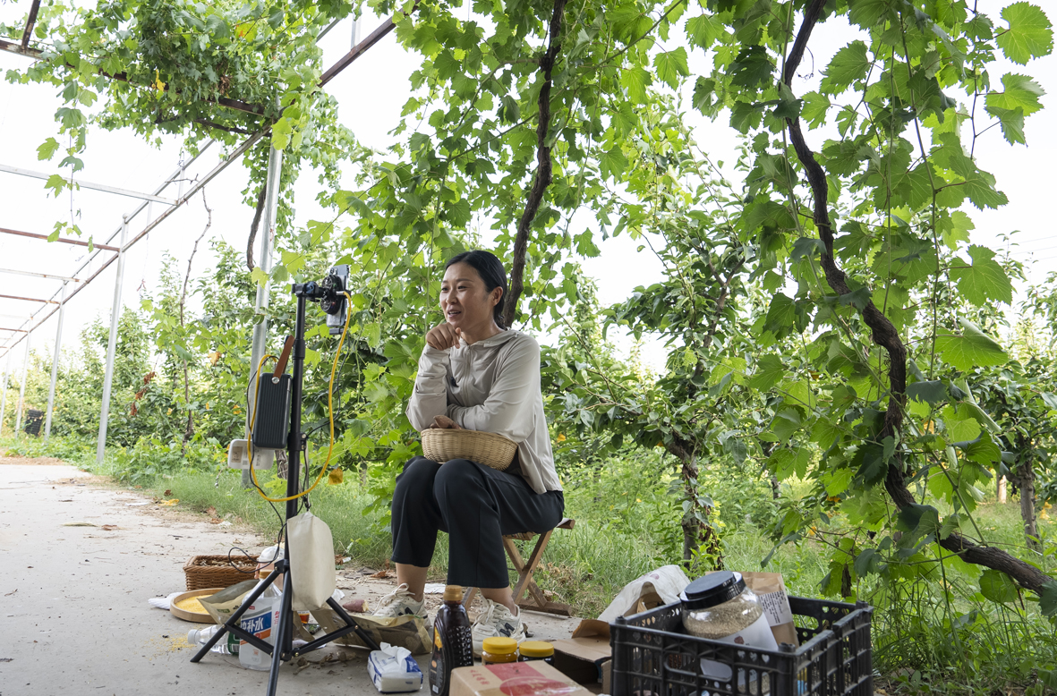 “我家就在这附近,村里的东西我都会帮着在网上卖,最多时一场直播开播半小时就卖了1万多单。”时值正午,葡萄棚被阳光烤得火热,而主播茉莉就在这棚下直播了近两个小时,虽满头大汗,但是谈笑间她的嘴角总在上扬。