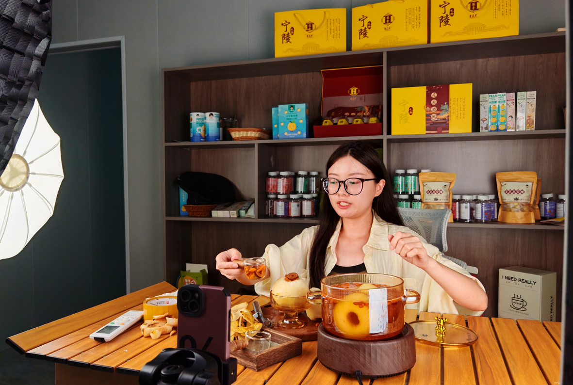 河南小梨妹食品科技有限公司主播正在宁陵梨产业直播孵化基地直播推荐梨产业。高会鹏 摄