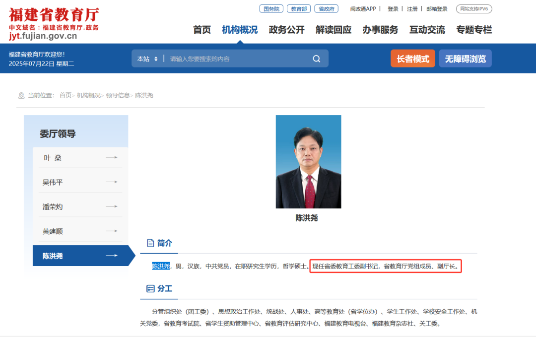 近日,福建省教育厅网站更新显示,陈洪尧现任福建省委教育工委副书记,省教育厅党组成员、副厅长。