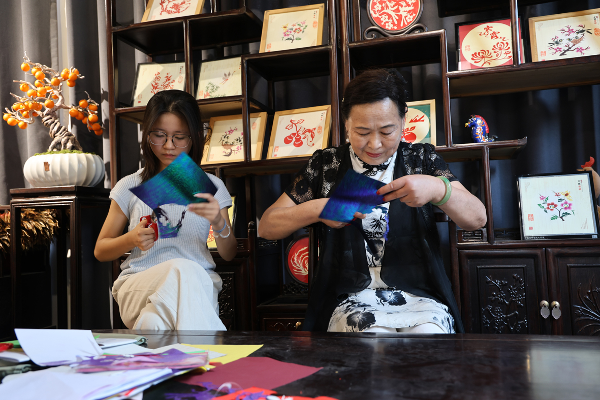 河南省非物质文化遗产剪纸项目代表性传承人胡明(右)和孙女刘洛汐在一起创作。商丘日报融媒体记者 张壮伟 摄