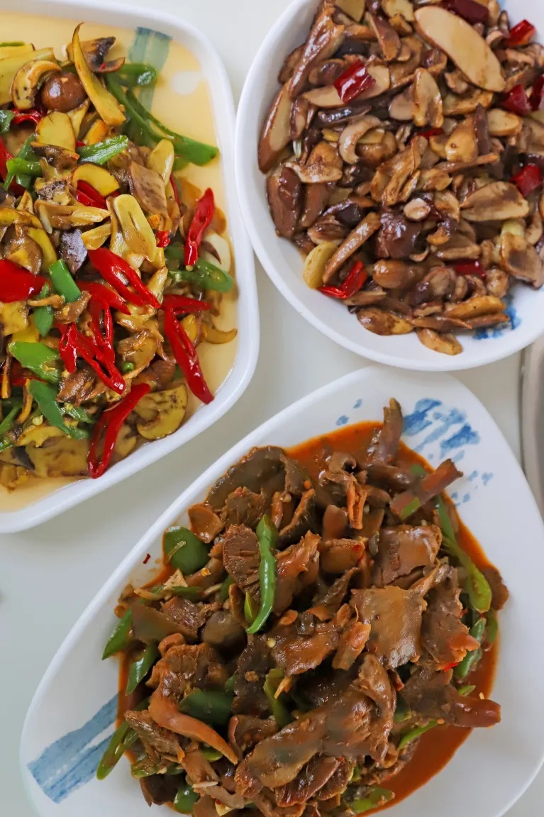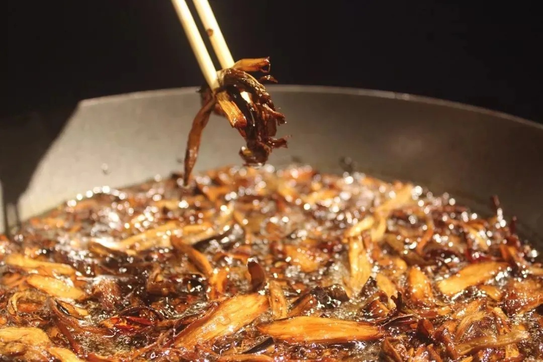 鸡枞的待遇更隆重。刚采的鸡枞撕成条,热油爆香蒜片青椒,大火爆炒到边缘微焦,撒把盐就香得人直跺脚;讲究点的用香油炸透,装瓶封存,冬天拌面条时挖一勺,油脂香混着菌鲜,分不清是荤是素。