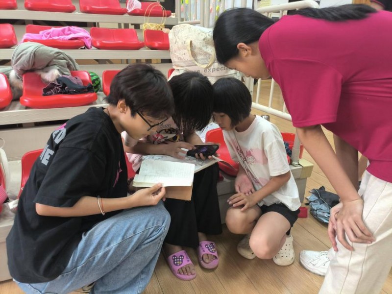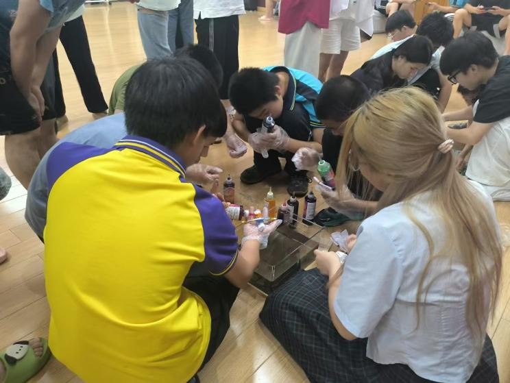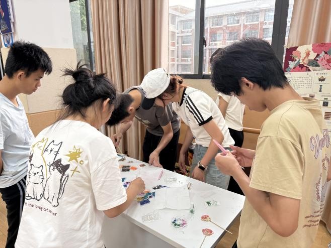 活动现场,实践团队精心策划,将掐丝珐琅、漆扇、扎染三种极具魅力的非遗工艺体验课程带进课堂,13 名成员分成三组进行分组教学,让学生们能深入感受不同非遗工艺的独特韵味。在掐丝珐琅体验区,队员们耐心细致地指导学生填注色彩釉料,学生们在亲手操作中,真切感受着传统金属工艺的细腻与瑰丽;漆扇制作区里,学生们饶有兴致地在水中滴入漆料,将扇子缓缓浸染其中,亲身领略传统漆艺与实用器物的融合之美;扎染体验区,大家跟着队员的指导,一步步完成折叠、捆扎、染色的工艺步骤,亲眼见证白布在染料中绽放出独一无二的晕染图案,脸上洋溢着惊喜与自豪。