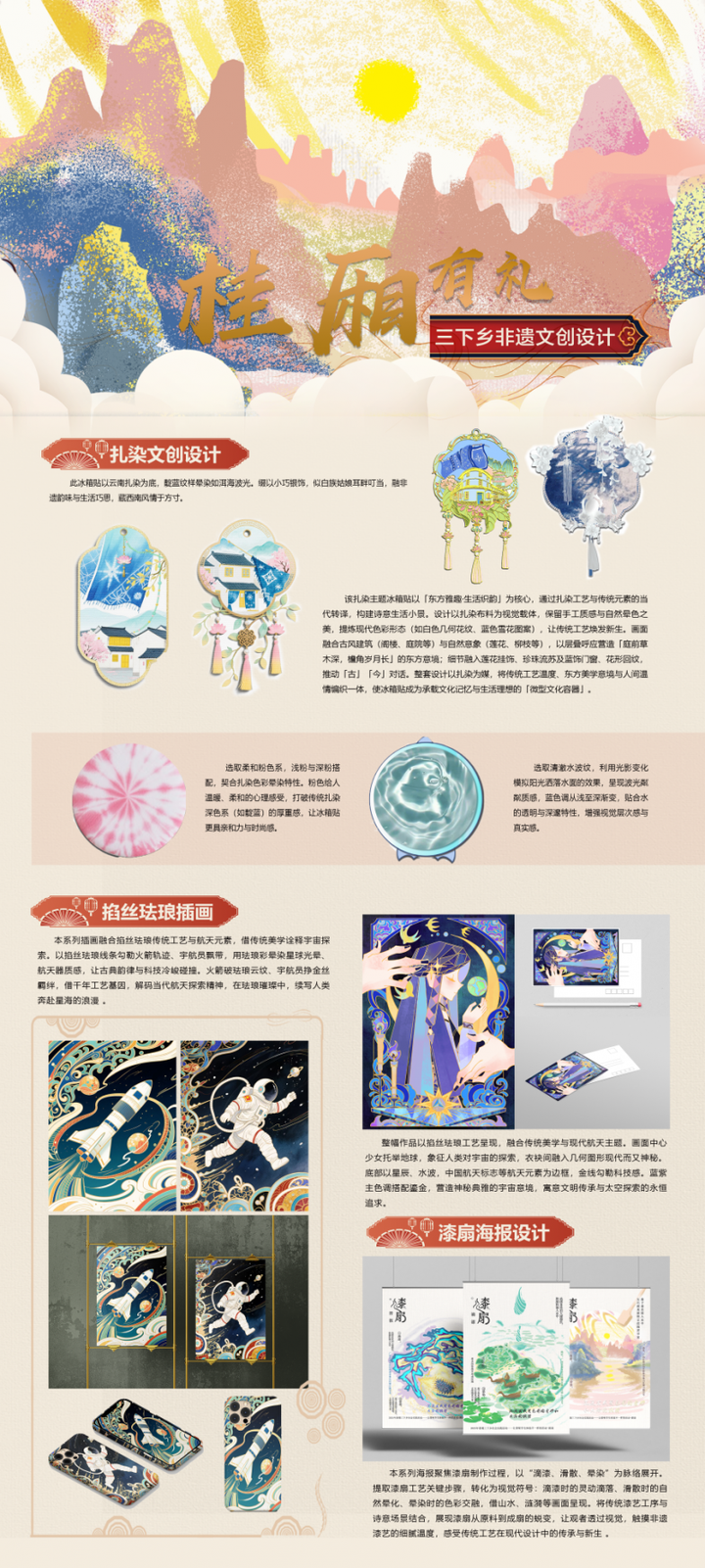实践团队在实地考察教学后,结合这三种非遗传统文化进行了深入的设计创作。围绕扎染工艺,他们精心制作了四个扎染元素冰箱贴和两个扎染元素徽章,将扎染的灵动与生活实用巧妙结合;针对漆扇制作,创作了三张漆扇制作过程系列海报,生动展现了漆扇制作的每一个精彩瞬间;而在掐丝珐琅与航天元素的融合上,更是别出心裁,设计了两张系列掐丝珐琅风格 + 航天元素插画和一张掐丝珐琅风格 + 航天元素明信片,让传统非遗与现代航天文化碰撞出奇妙的火花。