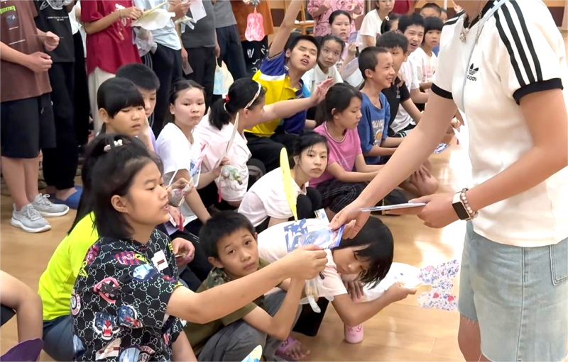 除非遗文化体验及相关设计创作外,实践团队还特别准备了桂林航天工业学院航天日主题明信片,赠予聋哑学校的学生。这些明信片以火箭发射、宇航员等航天元素为设计主体,巧妙融入了学校特色航天文化符号。队员们通过图文讲解的方式,向学生们生动介绍中国航天发展历程与航天精神,在他们心中播下探索宇宙的种子。