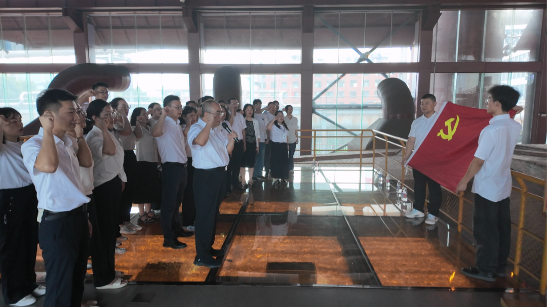 在武钢一号高炉工业遗址公园,全体党员认真聆听讲解,回顾我国钢铁业的发展壮大、自立自强之路。金色炉台前,大家面对鲜红的党旗高举右拳,“人民英雄”国家荣誉称号获得者张定宇领誓,重温入党誓词。循着讲解员的讲述,1958年第一炉铁水奔腾的壮阔场景浮现眼前,感悟“钢铁报国”的党员突击队精神,从工业史中汲取“技术自立”的奋进力量。