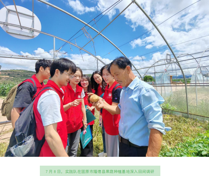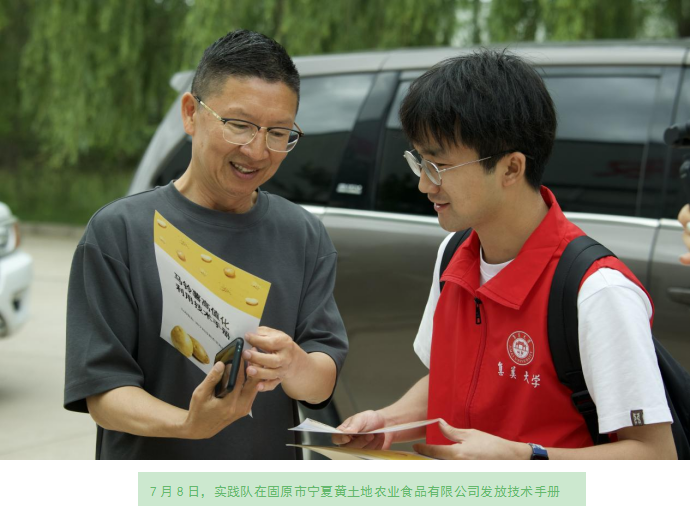 依托学校在酶制剂技术领域的优势,实践队聚焦生物制剂、马铃薯加工及药食同源中草药三大领域,精准破解当地农业技术难题。在中卫市宁夏乙征生物工程有限公司,实践队与企业围绕微生物发酵技术展开深度对话,让理论与实操无缝衔接;在隆德县闽宁协作产业园及果蔬种植基地,实践队详细了解紫甘蓝、番茄、马铃薯等农产品的种植环境与技术要点,并针对“马铃薯淀粉利用率低”这一痛点现场“把脉开方”,送上《马铃薯高值化利用》技术指南;在泾源县六盘山镇中药材种植有限公司,实践队在听取了企业负责人讲解后,对中药材精深加工、提升产业效益等问题“建言献策”。调研全程,队员们随身携带的笔记本上,密密麻麻记满了给企业和农户的技术小贴士,字里行间都是跨越山海的牵挂。农户纷纷表示:“技术送到家门口,增收有了新盼头。”