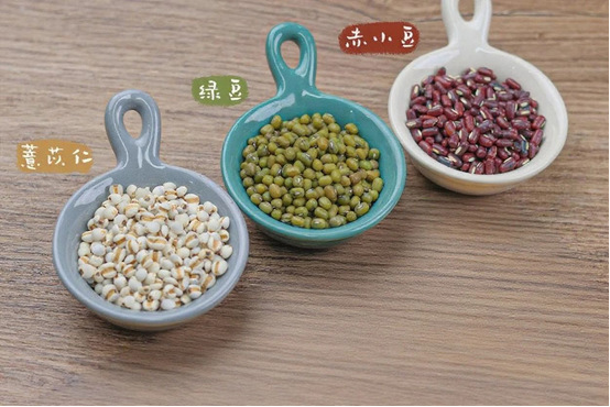薏苡仁、赤小豆、绿豆各50g,洗净入锅,加适量水,小火煮成粥。