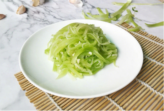 莴苣适量,去皮,切成丝,入开水锅中焯一下,加盐、味精、麻油拌匀即可。