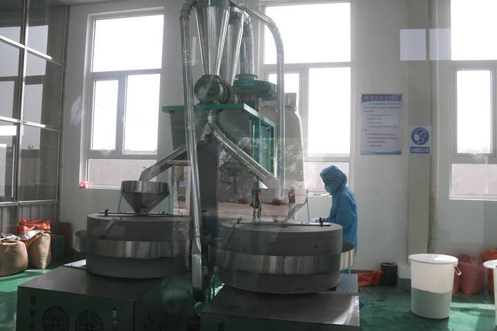 诸葛村面粉加工厂内,工人正在操作石磨机器磨制面粉