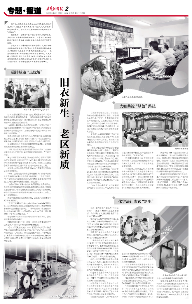 在废旧纺织大肆浪费与污染的背景之下,为探秘再生纺织品领域连续化量产技术,由中国经济传媒协会主办、安徽经济报业承办的“聚焦环保新质生产力———走进安徽新登利”调研活动在六安市金寨县举行。人民日报、光明日报、科技日报等近20家主流媒体,走进安徽新登利环保科技有限公司(以下简称“新登利”),探寻这家企业“摇变”为环保新质生产力先锋的生动印记。