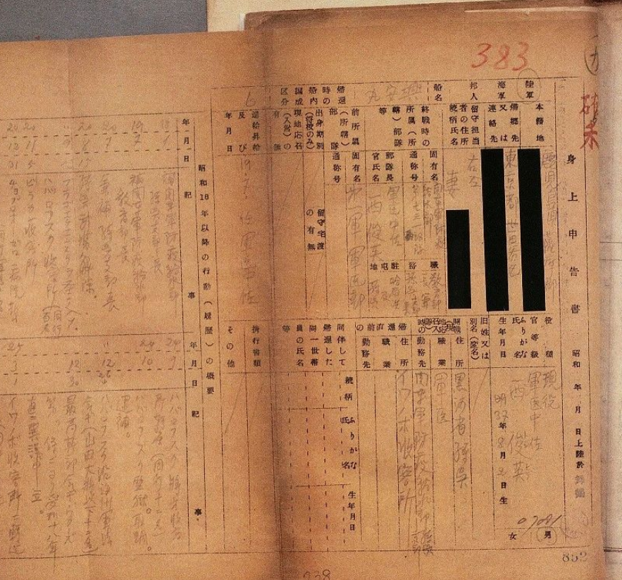 ▲侵华日军第七三一部队《身上申告书》中西俊英的个人登记信息