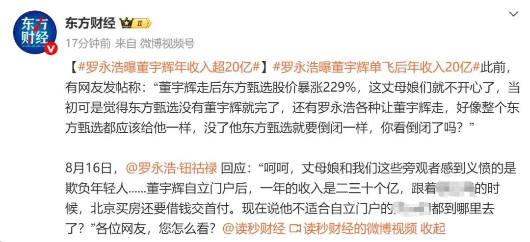 此外,罗永浩发文称“董宇辉自立门户后,一年的收入是二三十个亿”,还称其未独立时“北京买房还要借钱交首付”。