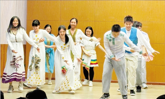 新生晚会上,北京外国语大学阿姆哈拉语专业新生身着埃塞俄比亚民族服饰表演当地传统舞蹈。 受访者供图