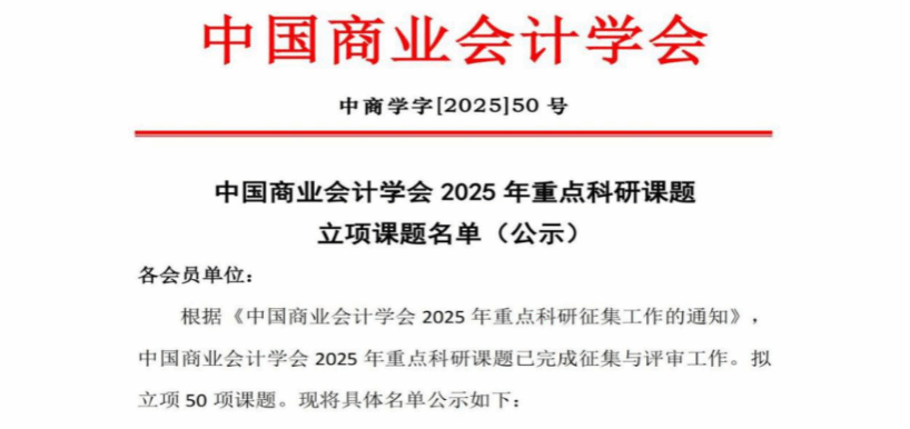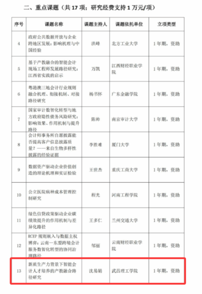 近日,中国商业会计学会2025年重点科研课题立项课题名单公示,武昌理工学院商学院沈易娟教授主持申报的课题《新质生产力背景下智能会计人才培养的产教融合路径研究》,再次获得重点科研课题立项,并获得立项经费1万元。