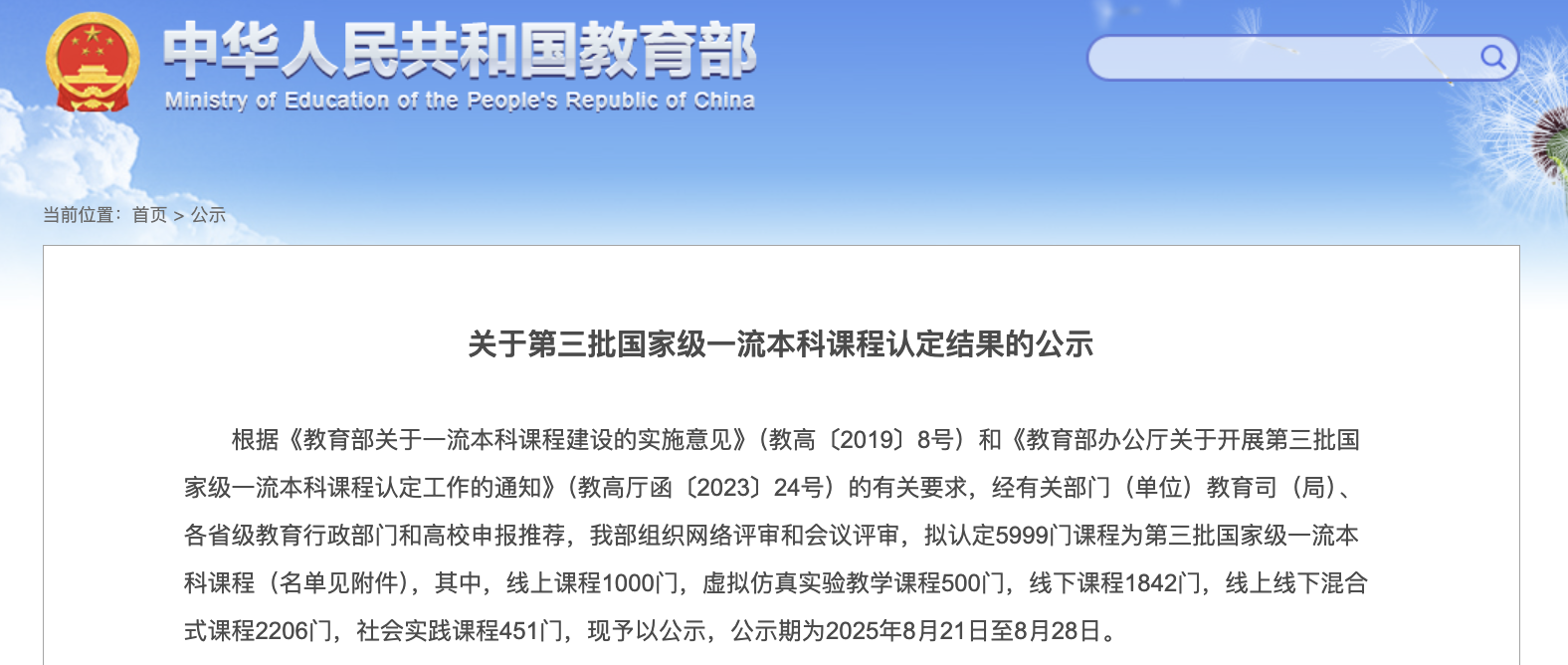 8月21日,教育部网站发布关于第三批国家级一流本科课程认定结果的公示。
