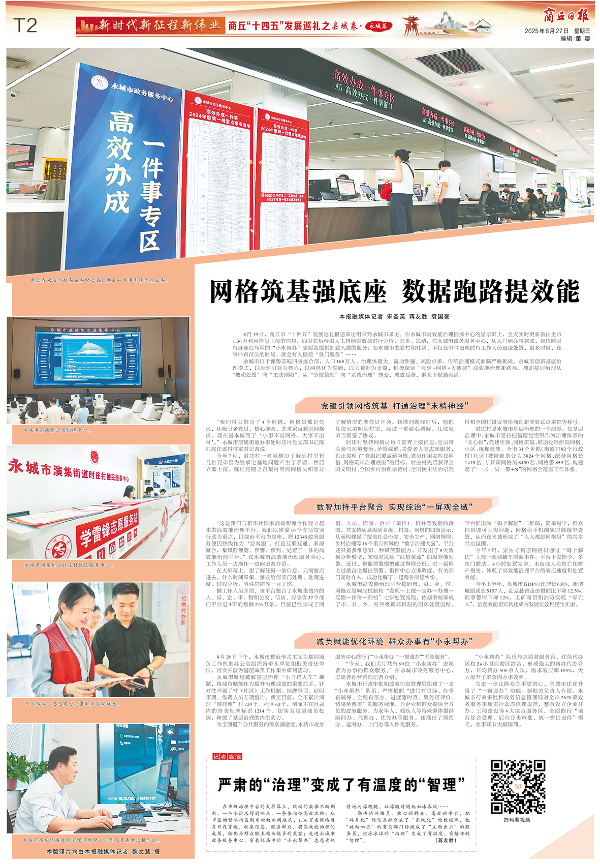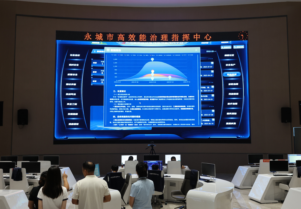 2025年8月19日,河南省商丘市“十四五”发展巡礼报道采访组来到永城市采访。在永城市高效能治理指挥中心的显示屏上,全天实时更新着由全市1.36万名网格员上报的信息,同时在后台由人工智能对数据进行分析、归类、总结;在永城市政务服务中心,从入门到办事完成,身边随时有身穿红马甲的“小永帮办”志愿者提供细致入微的服务;在永城市的农村和社区,不仅在事件出现时有工作人员迅速处置,很多时候,在事件有苗头的时候,就会有人提前“登门服务”……