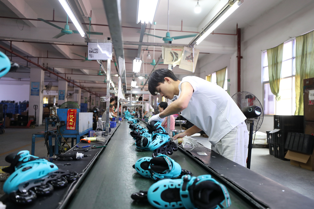 富宏运动生产车间内,一双双轮滑在机器和工人的合作下诞生。惠报全媒体记者杨建业 摄