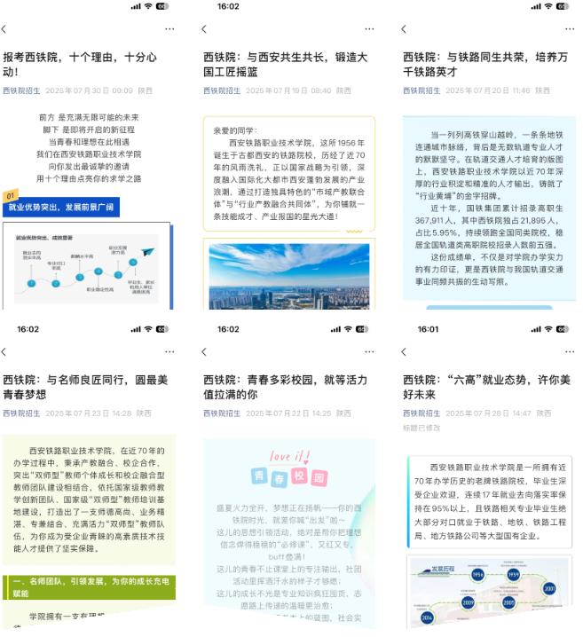 精心策划包装,发挥新媒体影响力。招生期间,西铁院不断开拓思路,充分发挥校内外新媒体平台作用,以加强整合传播为思路,激活网络宣传效能,全面展现学院专业特色、创新能力、管理水平、校园文化等方面的发展成就与特色。据悉,2025年招生季,该学院共策划推出了《西铁院,与西安共生共长,锻造大国工匠摇篮》《报考西铁院,十个理由、十分心动》等7个专题的主题宣传微信公众号推文133篇,总阅读次数超过52万次,公众号关注人数突破8万人。微信视频号累计播放量超过100万。抖音号推送《院长说专业》等各类型短视频120部,总浏览次数超过150万次。在招生宣传头部媒体和各类自媒体平台发布宣传稿件70余篇,社会影响力提升效应凸显。学院还获评“年度新媒体影响力高职院校”,整合传播成效显著。